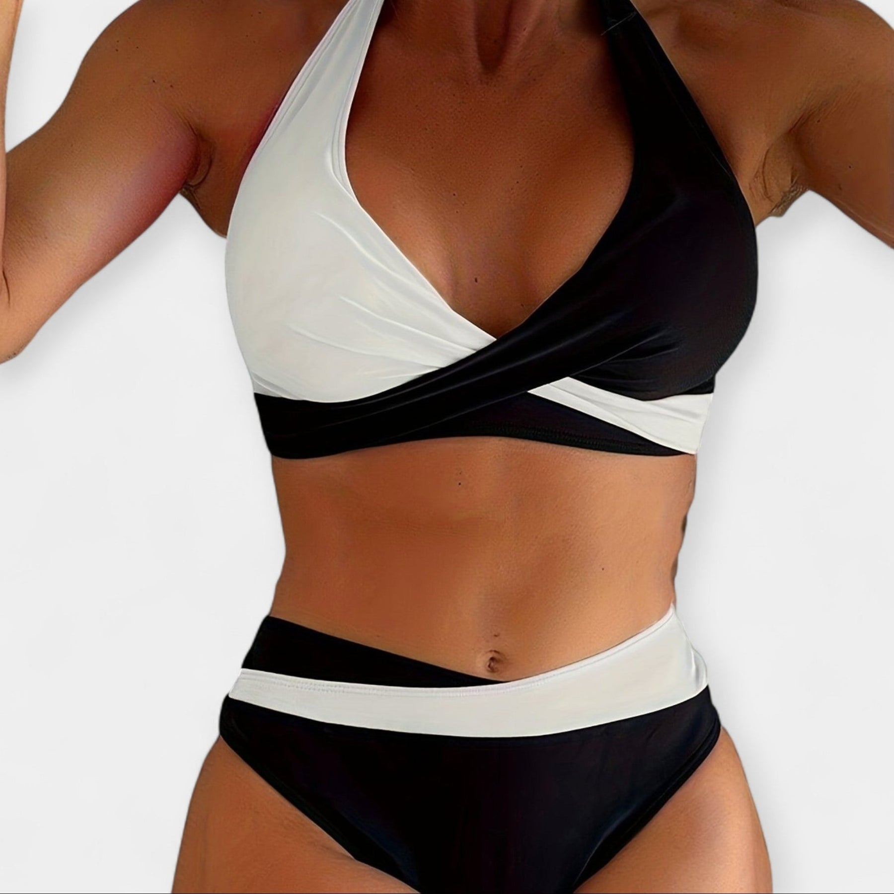 Този секси бански от две части впечатлява с чистите си линии и кръстосаната си детайлност при деколтето. Той подчертава женствеността по дискретен начин, идеален за елегантна визия на плажа или за летни излети.