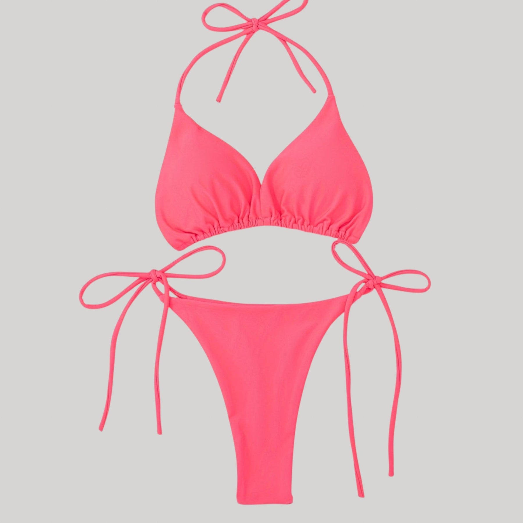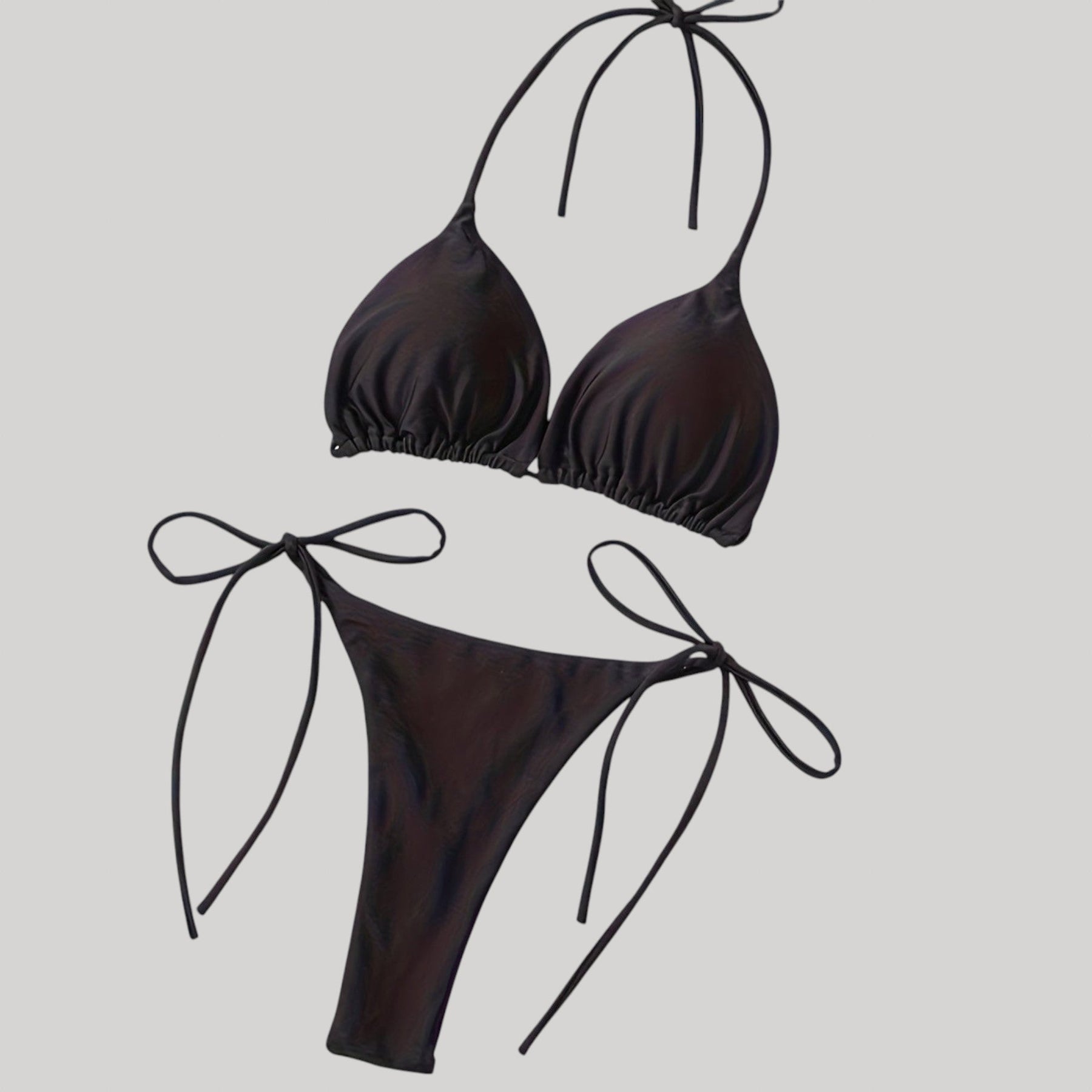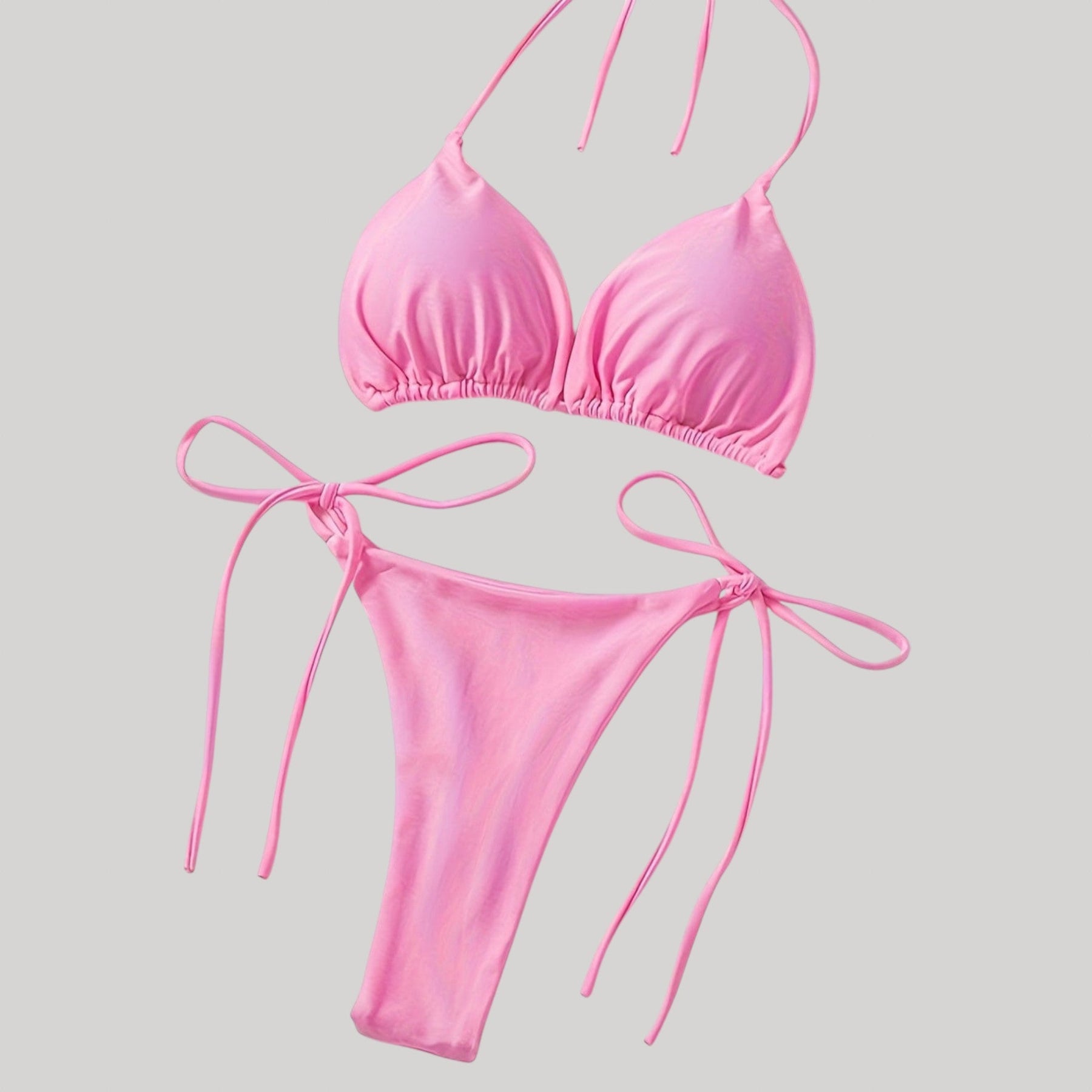 Този модерен комплект бански подчертава женствеността по елегантен и дръзk начин. Горнището със завързване на врата осигурява стабилност и опора, докато бикините с V-образна форма оформят бедрата и създават съблазнителен силует — идеален за привличащи вниманието летни визии.
