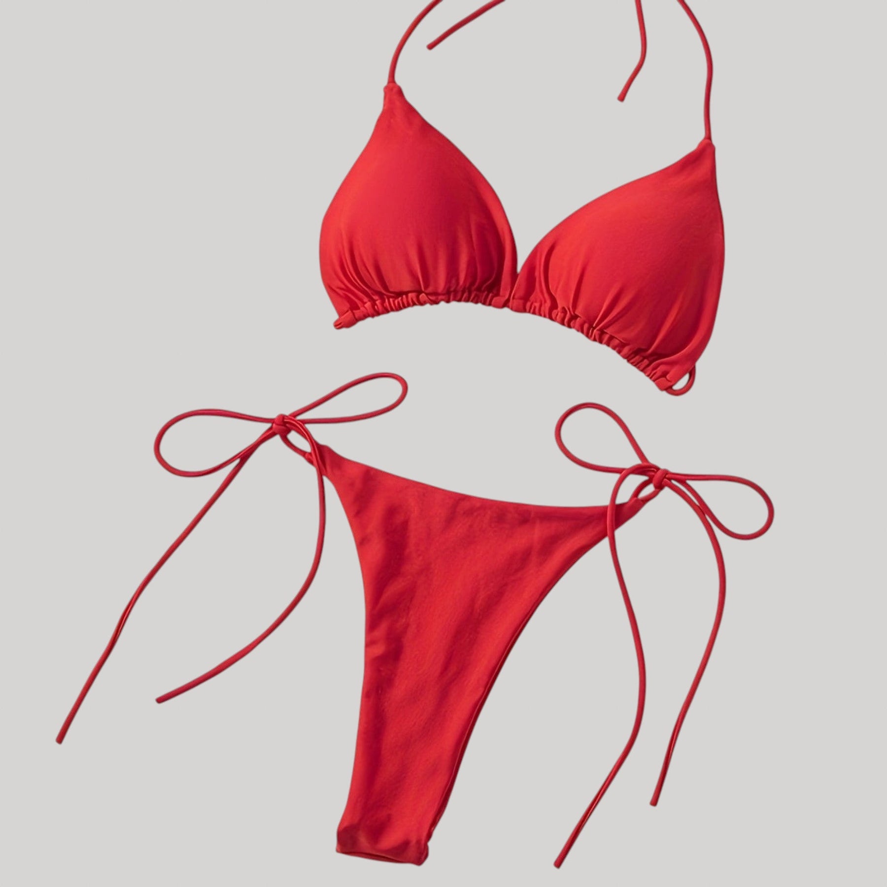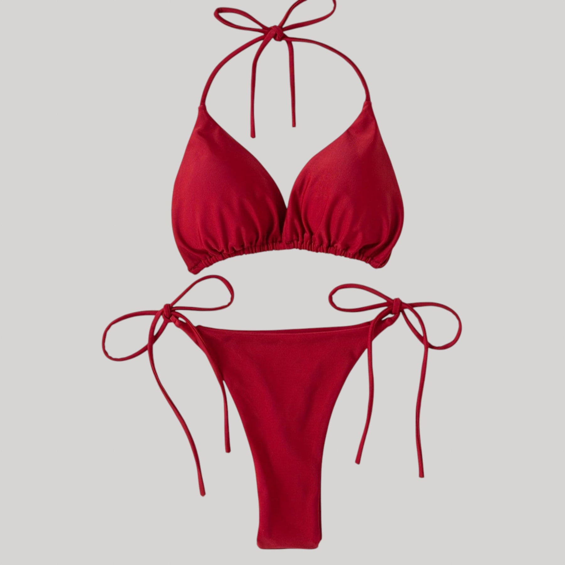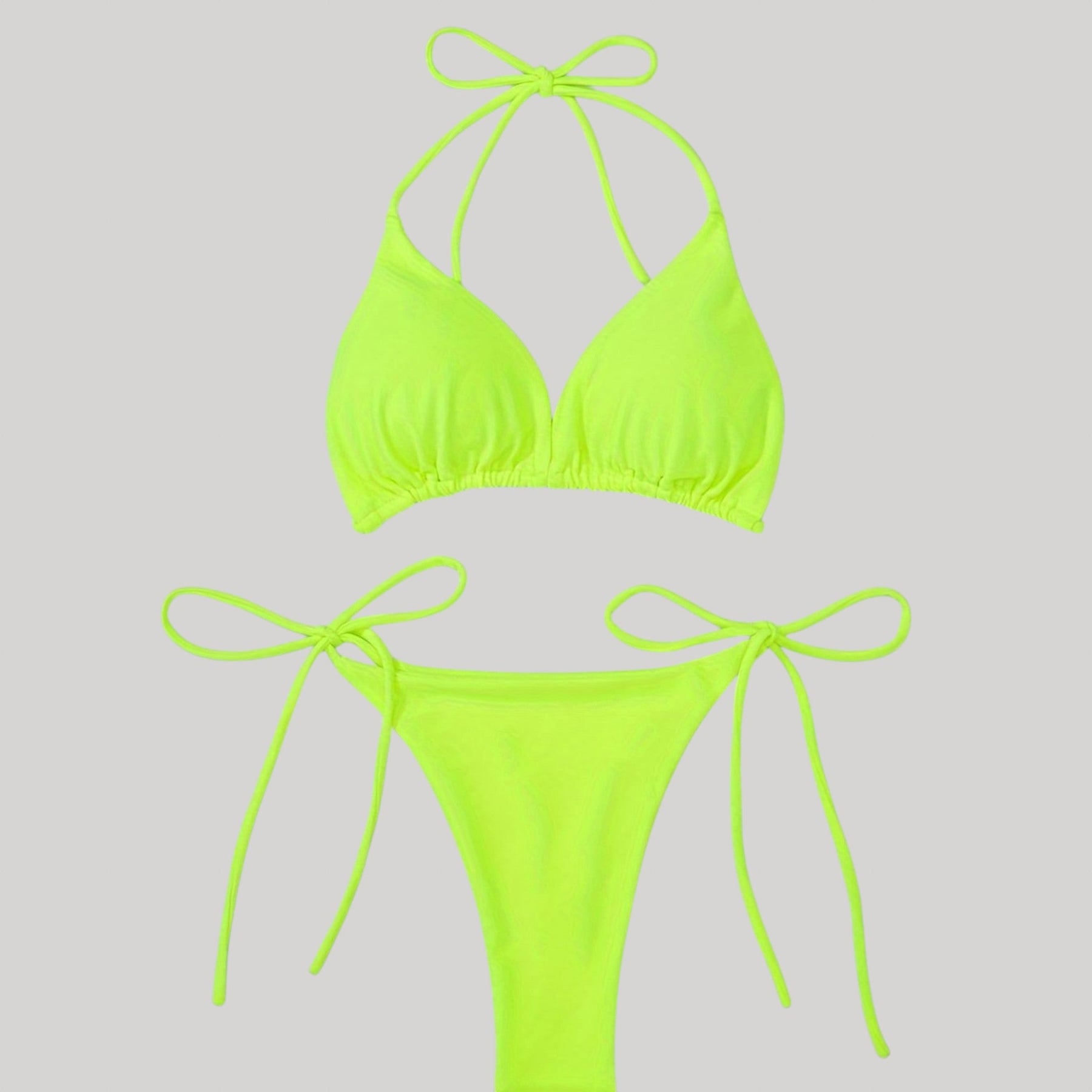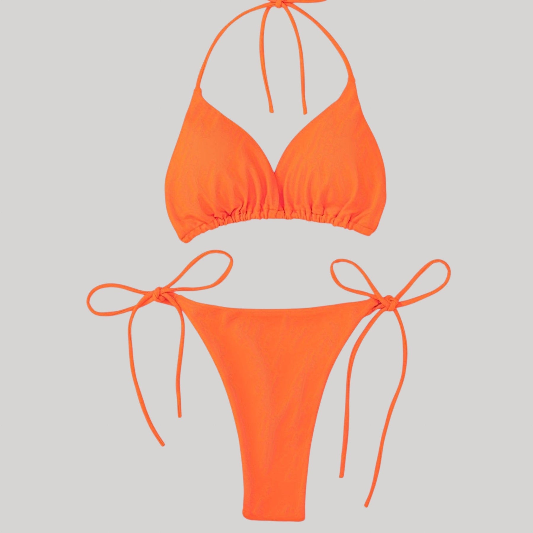 Този модерен комплект бански подчертава женствеността по елегантен и дръзk начин. Горнището със завързване на врата осигурява стабилност и опора, докато бикините с V-образна форма оформят бедрата и създават съблазнителен силует — идеален за привличащи вниманието летни визии.