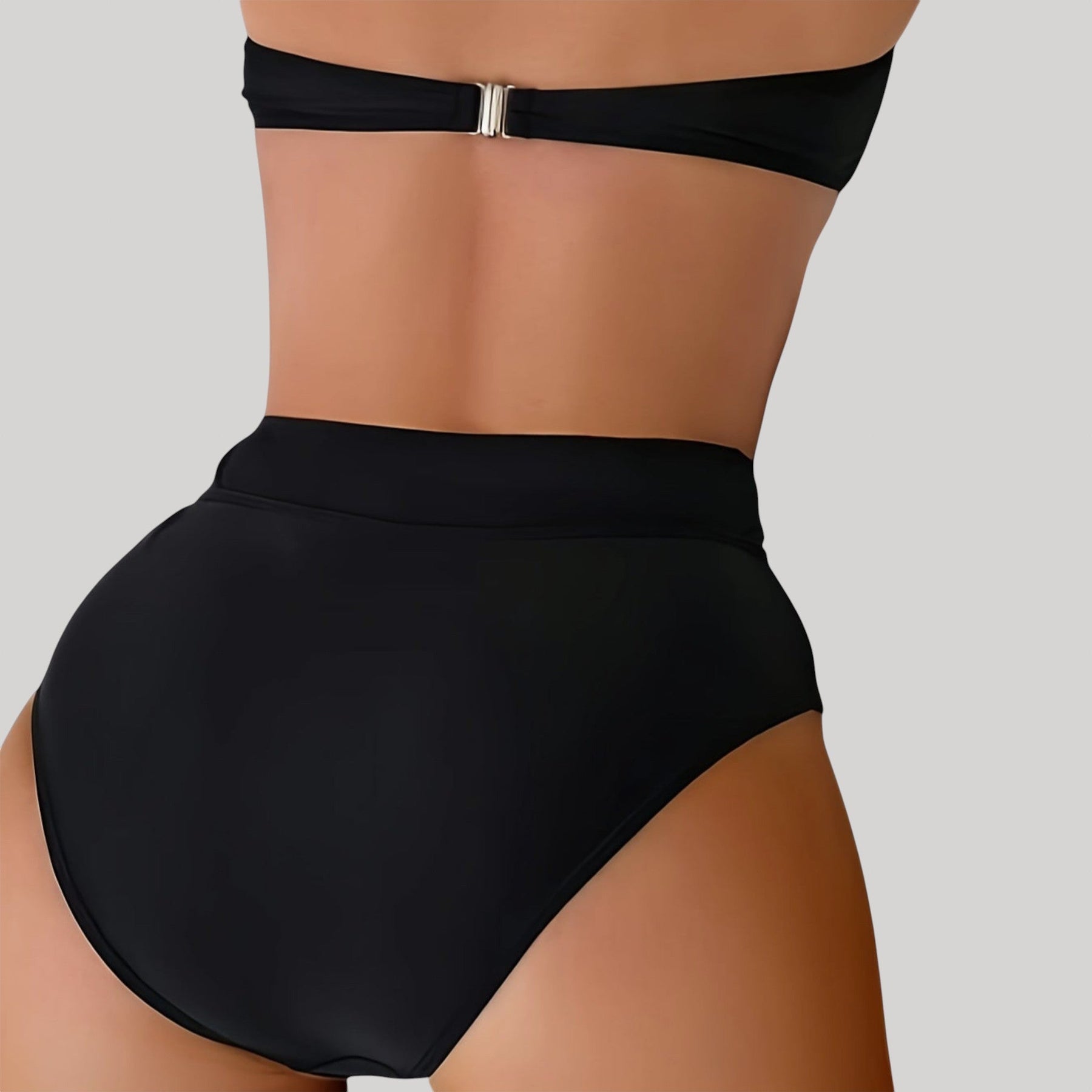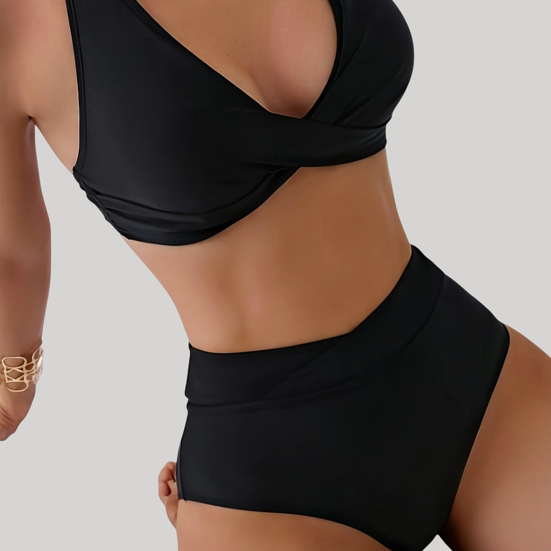 Този елегантен бански в две части подчертава силуета с едноцветен дизайн, дълбоко V-образно деколте и връзки зад врата (halterneck). Високата талия и изрязаната кройка на бикините придават допълнителна женственост, а еластичният материал осигурява комфорт и стабилност за всички летни моменти.