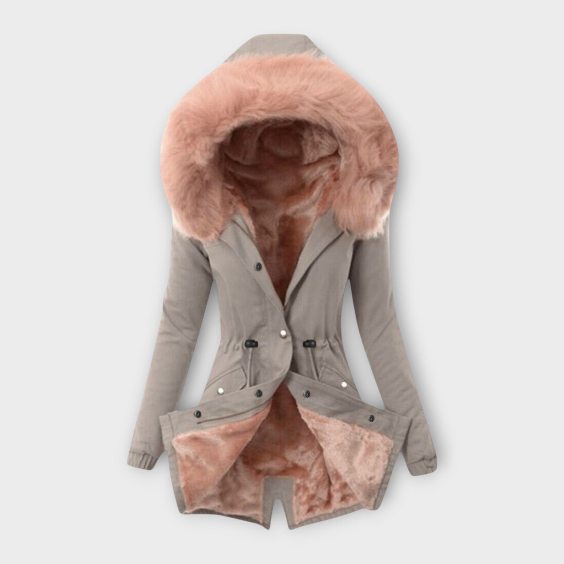 Просторната качулка е обшита навсякъде с мек, изкуствен пух, който не само предпазва от вятър и дъжд, но и добавя нотка елегантност.