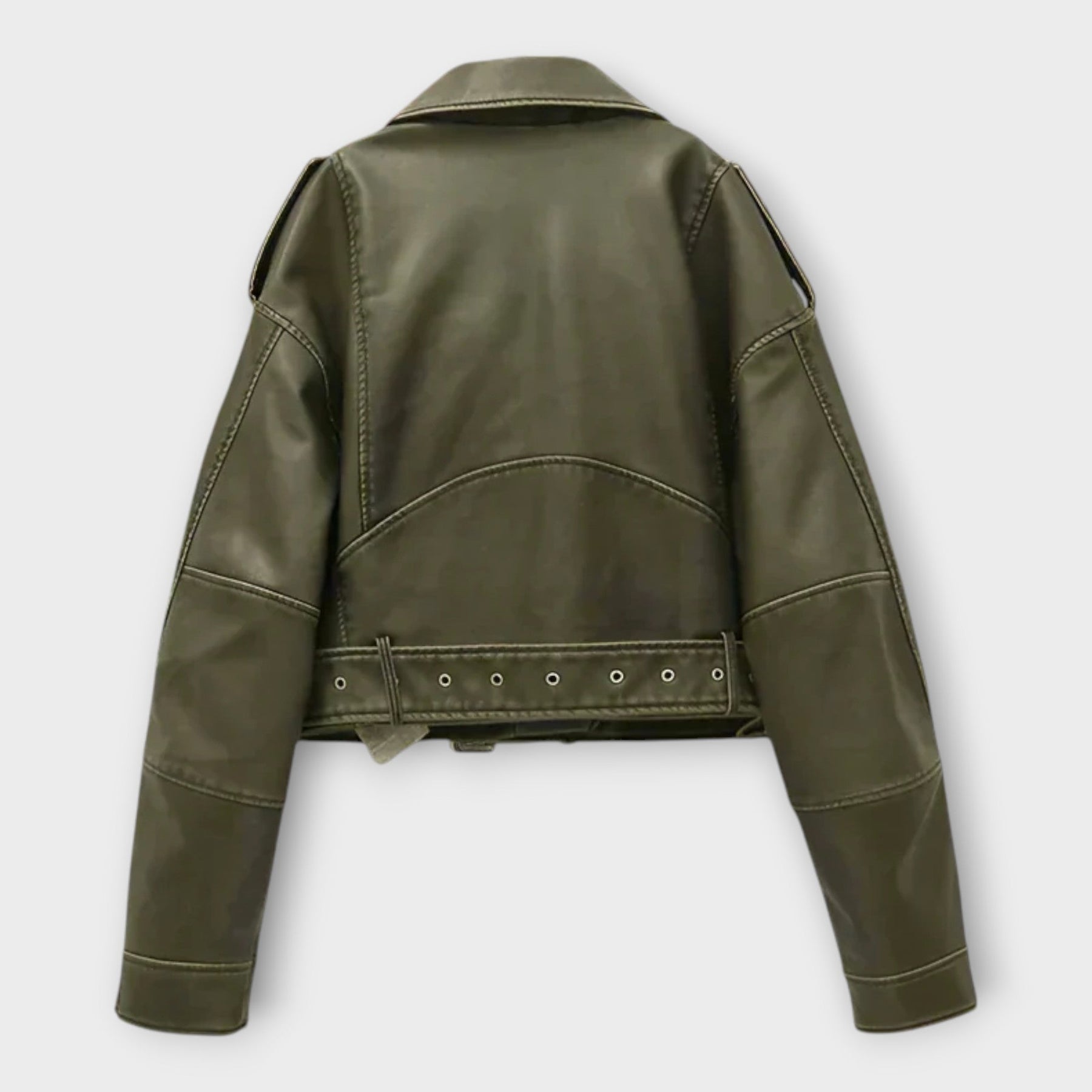 Модерно корти кожено яке с колан и изискан естетически стил