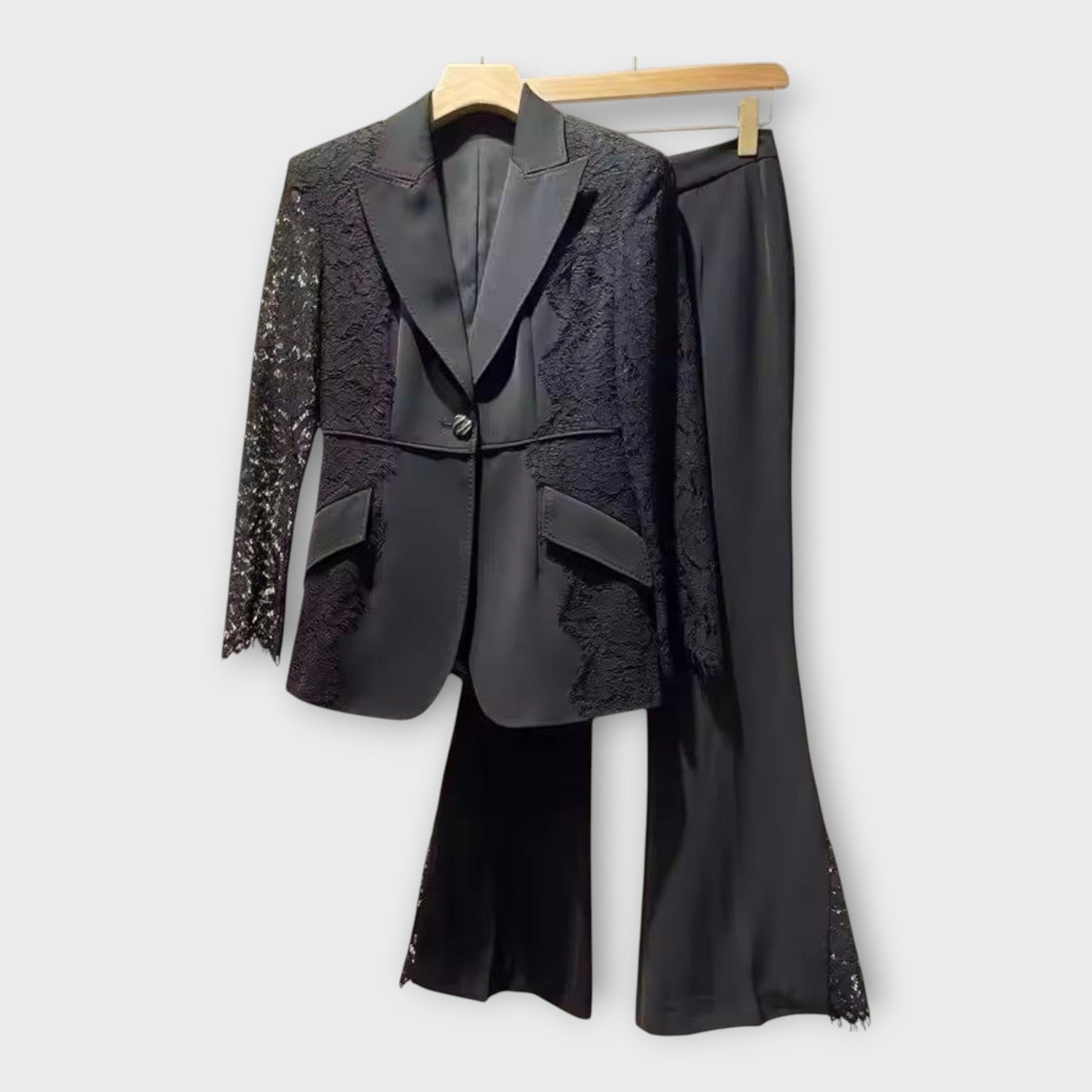 Впечатляващ комплект, който съчетава модерна естетика с вечна изтънченост и придава перфектния завършек на всяка визия. Изтънченият дизайн с дантелени детайли подчертава женствеността, а универсалната силуета прави комплекта идеален за всякакви случаи – от бизнес срещи до по-официални събития. Артикул, който обединява функционалност, удобство и изискан характер.