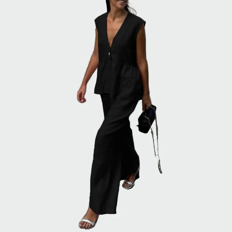 Придайте на стила си лекота и елегантност с този ефирен и лек комплект. Модерният дизайн съчетава комфорт и финес, което го прави идеален както за ежедневието, така и за по-специални поводи. Леката материя осигурява приятно усещане за прохлада и свобода на движението, докато стилната кройка добавя женственост и стил.
