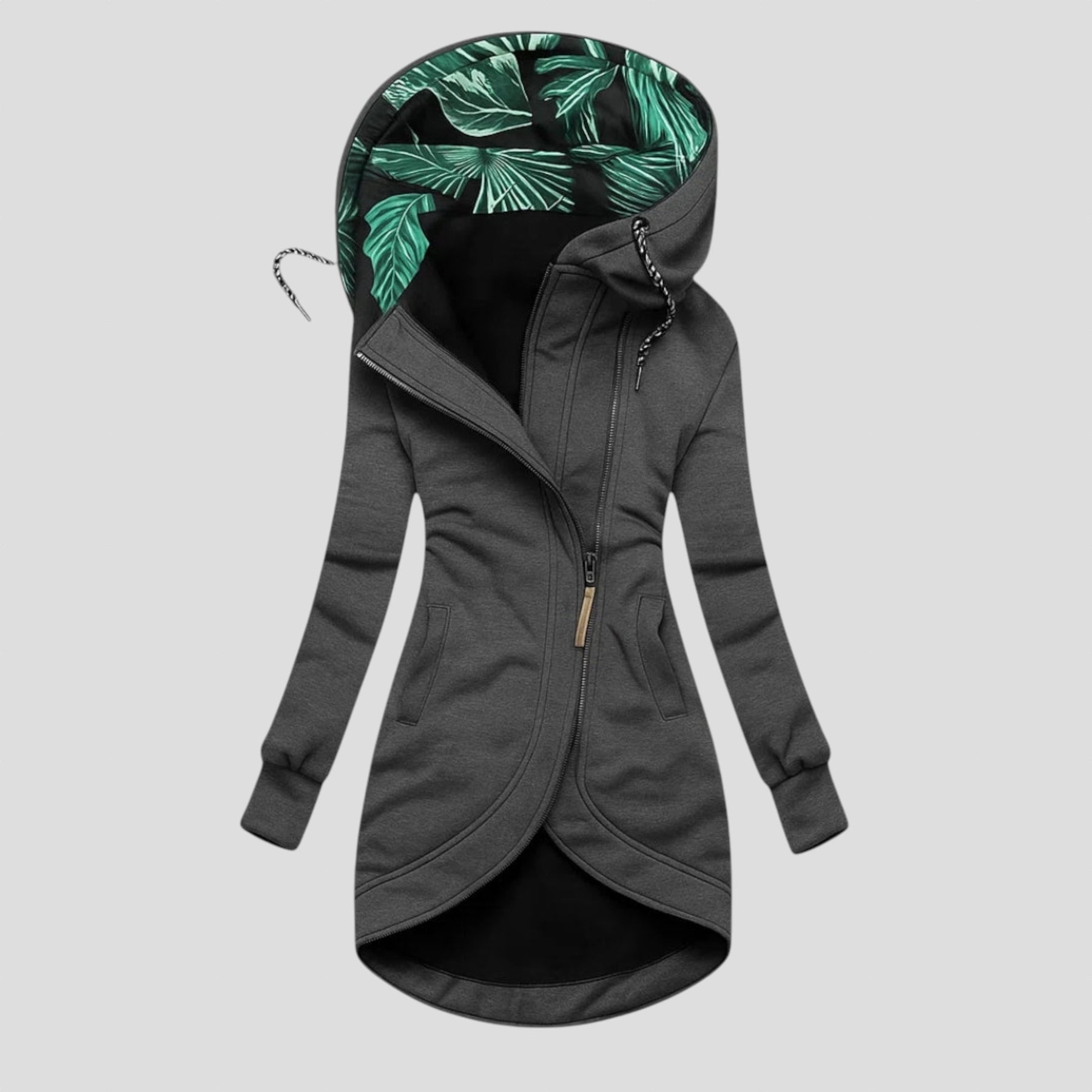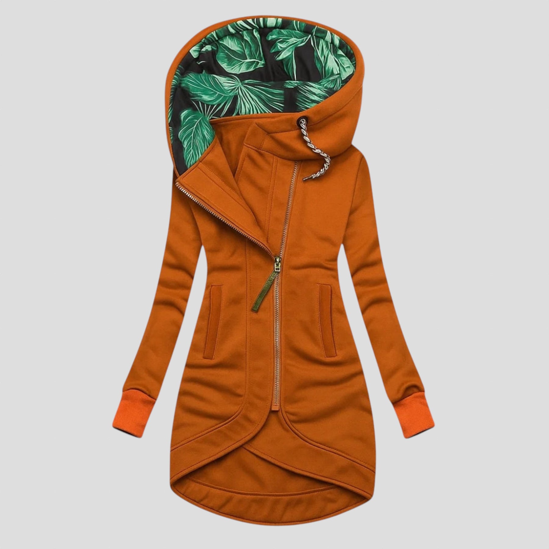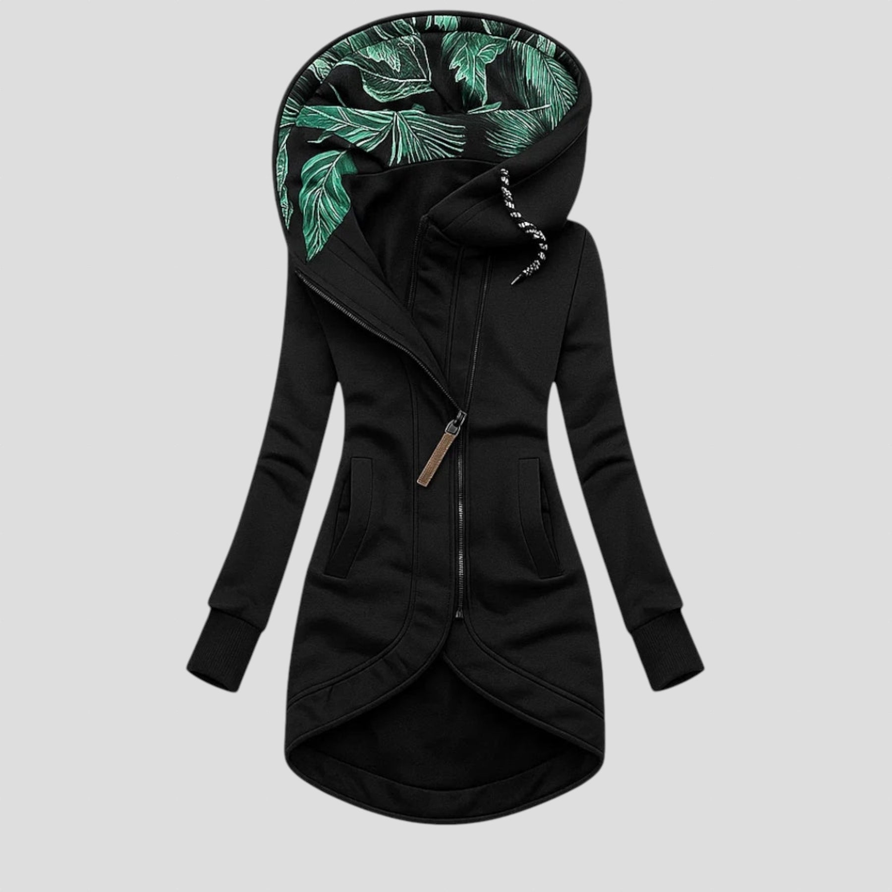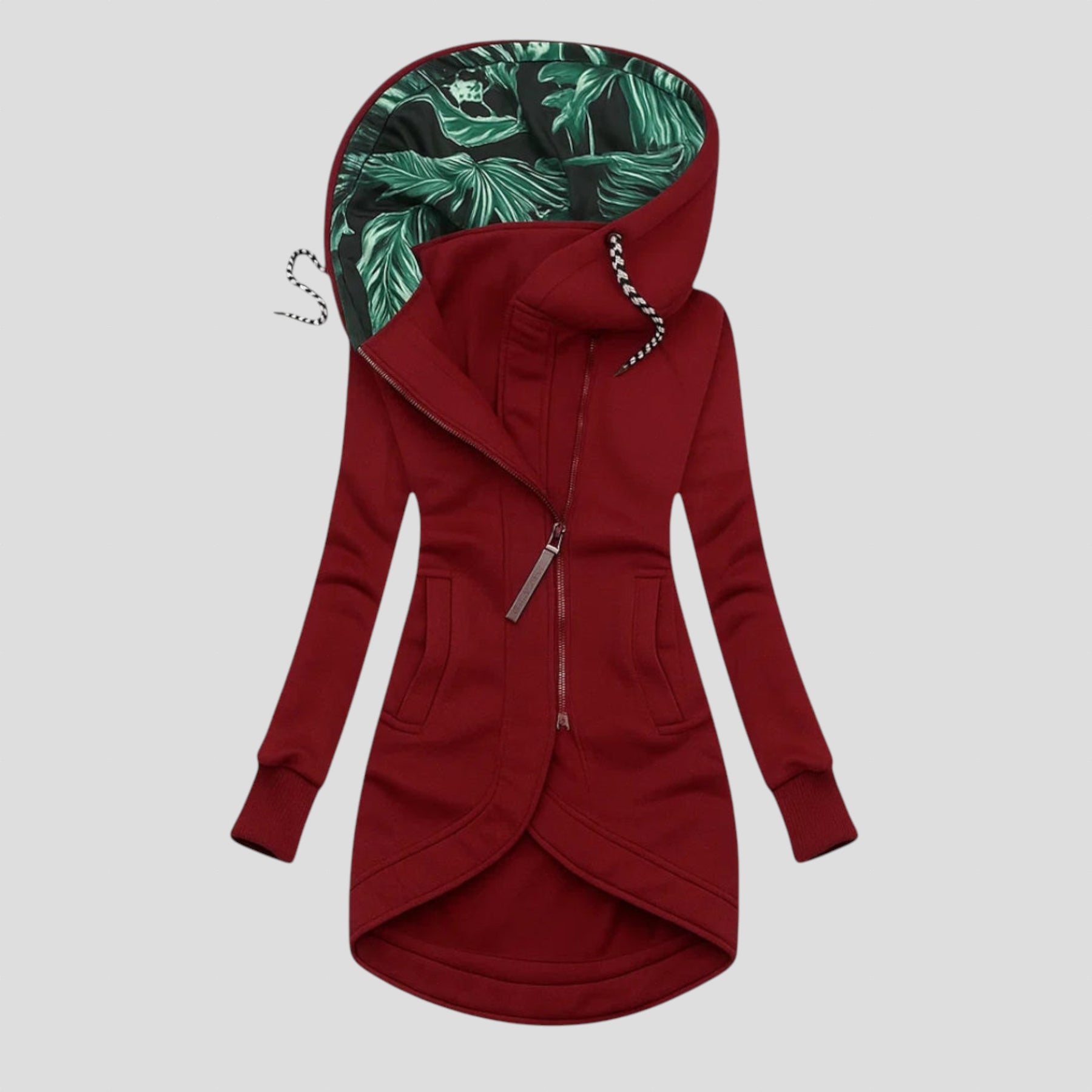Дамско яке с модерен асиметричен дизайн, създадено за жени, които търсят съчетание между комфорт и стил. Диагоналният цип и уникалната вътрешна подплата на качулката придават съвременна и елегантна визия, подходяща както за градския живот, така и за свободното време. Изработено от висококачествен плат, осигурява мекота и перфектно прилягане към тялото.