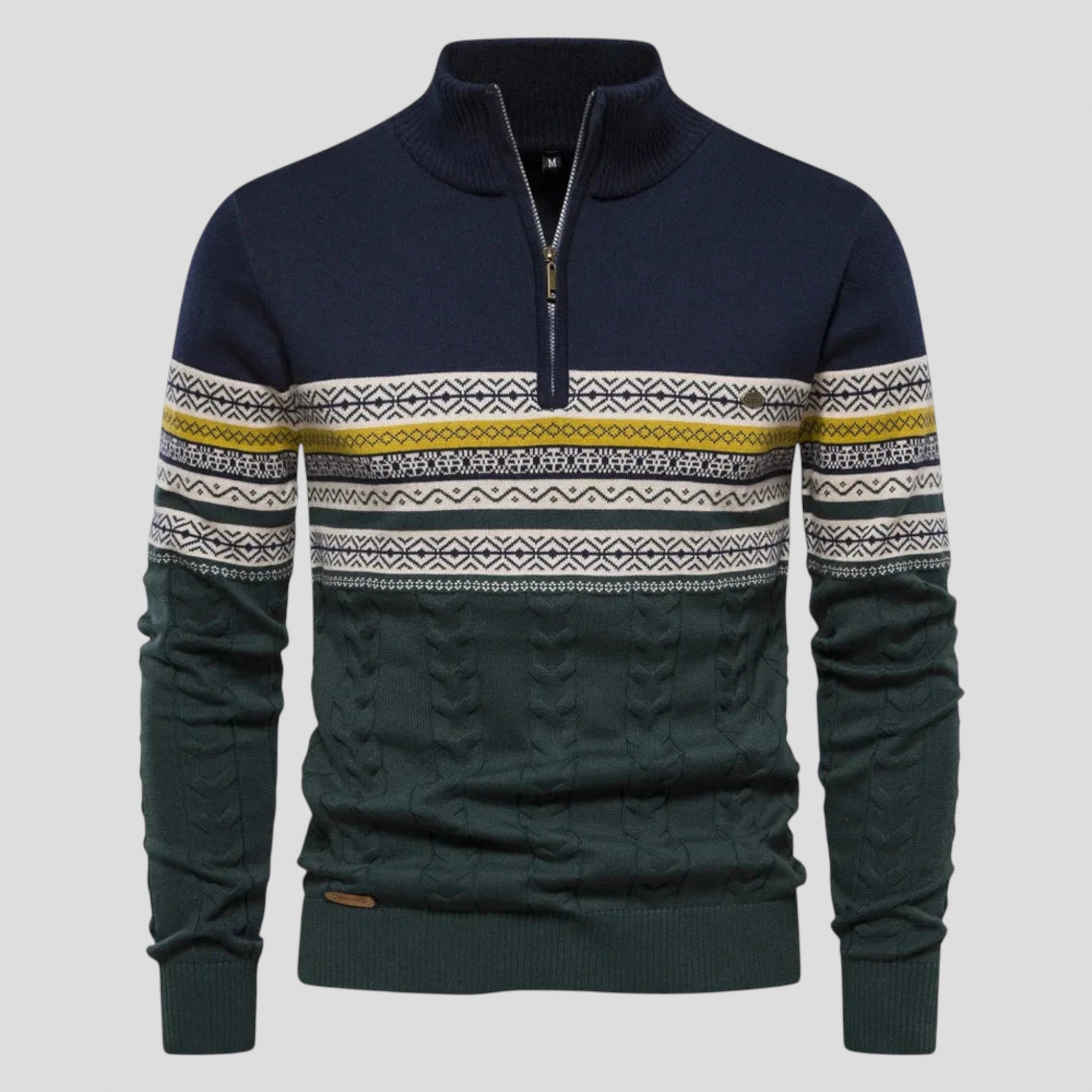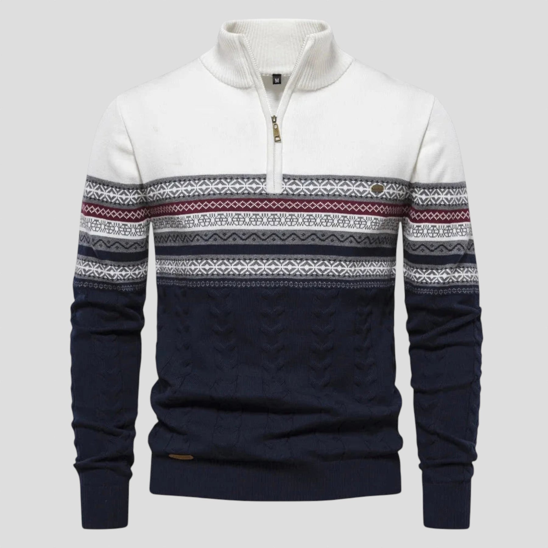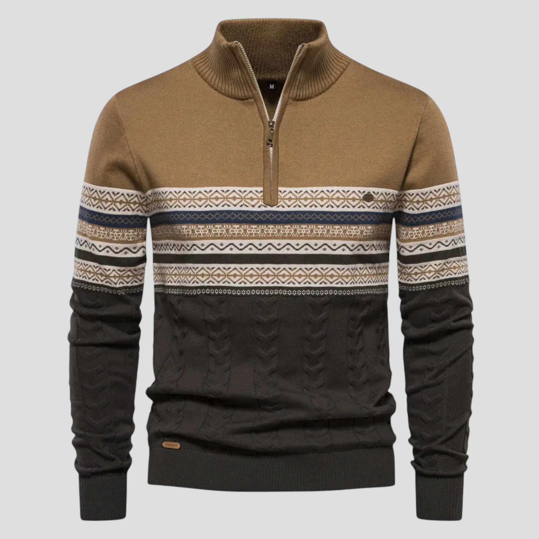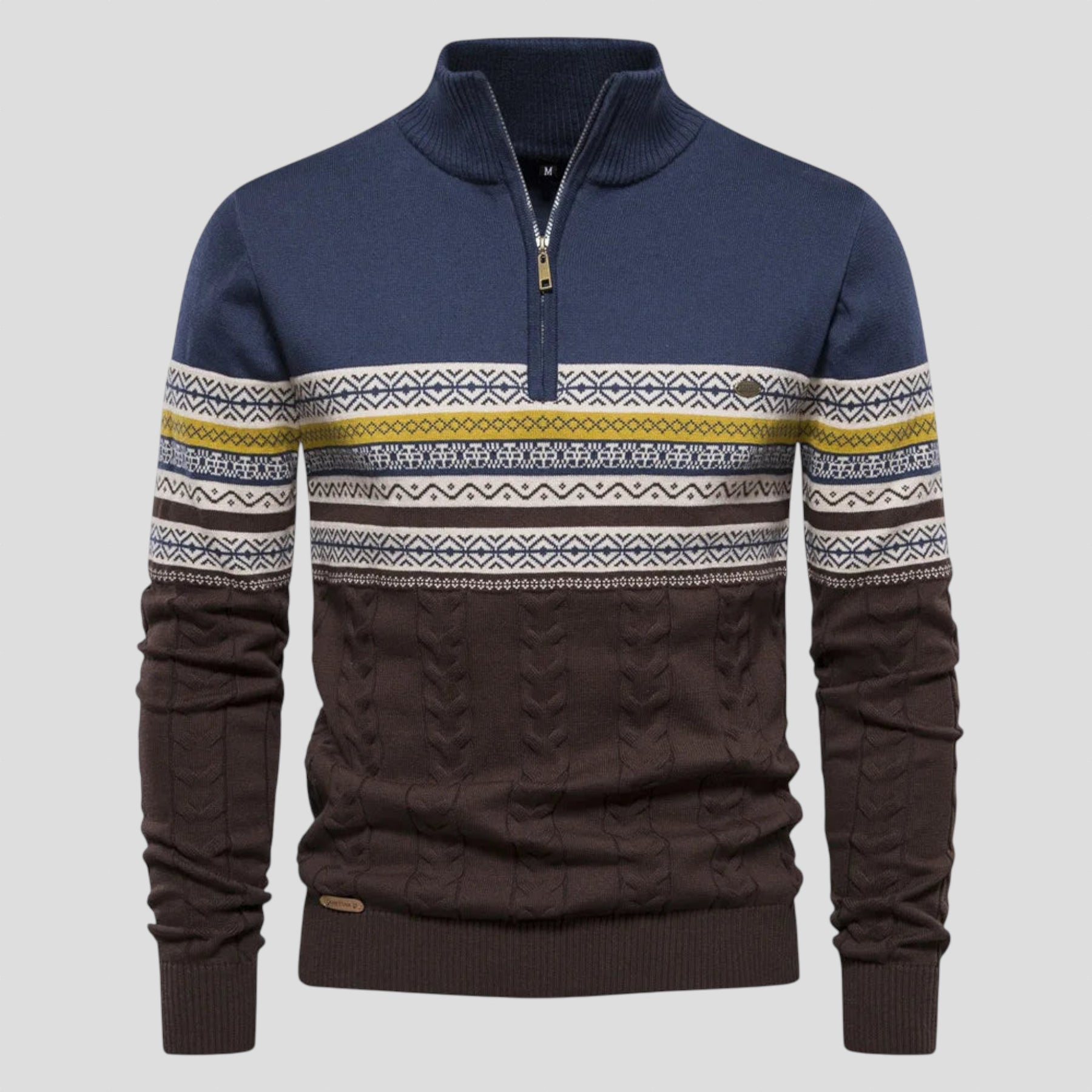 Пуловерът Jasper е перфектният избор за студените дни, когато искате да се чувствате топло, без да се отказвате от стила си. Традиционният Fair Isle мотив придава класическа визия, докато ципът до средата на гърдите осигурява регулируем комфорт. Изработен от мека памучна смес, този пуловер е удобен и издръжлив.